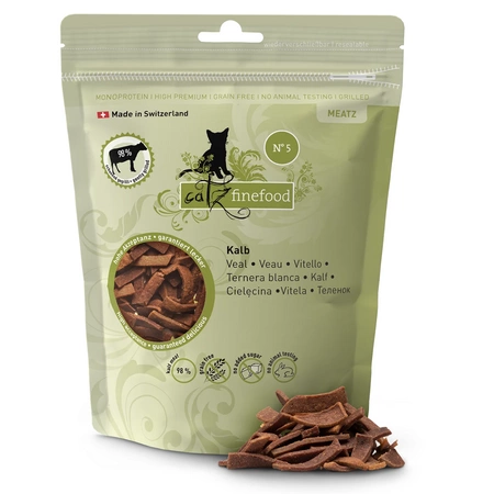 - Catz finefood Meatz N°5 to chrupiące paski z grillowanego i suszonego mięsa z cielęciny. Są doskonałym uzupełnieniem wysokiej jakości pełnoporcjowych karm mokrych Catz finefood.