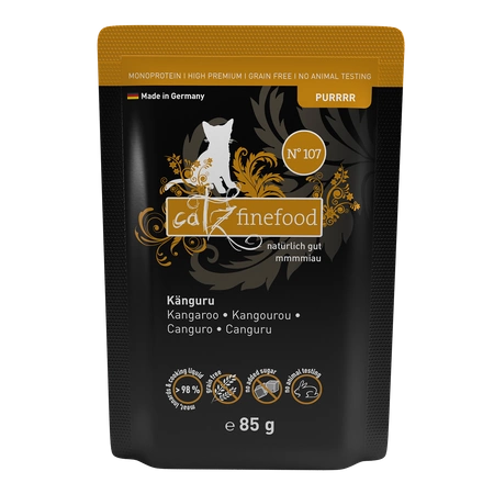 - Catz finefood Purrrr No. 107 stworzona jest z soczystego kangura, rosołu oraz oleju z ogórecznika. Ze względu na ograniczoną ilość składników idealnie nadaje się dla kotów, które cierpią na nietolerancję pokarmową.