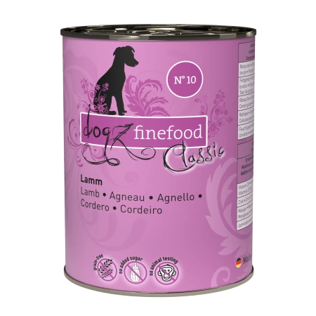 Pełnoporcjowa karma mokra Dogz finefood No. 10 stworzona jest z soczystej jagnięciny oraz aromatycznych dodatków takich jak borówka, cukinia, szałwia i szpinak. Nie zawiera konserwantów, sztucznych barwników i wzmacniaczy smaku oraz jest wolna od GMO.