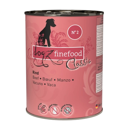 Pełnoporcjowa karma mokra Dogz finefood No. 2 stworzona jest z soczystej wołowiny oraz aromatycznych dodatków takich jak ziemniaki, marchew, mniszek lekarski i jabłko. Nie zawiera konserwantów, sztucznych barwników i wzmacniaczy smaku oraz jest wolna od GMO.
