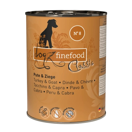 Pełnoporcjowa karma mokra Dogz finefood No. 8 stworzona jest z soczystego mięsa z indyka i owcy oraz aromatycznych dodatków takich jak amarantus i rozmaryn. Nie zawiera konserwantów, sztucznych barwników i wzmacniaczy smaku oraz jest wolna od GMO.