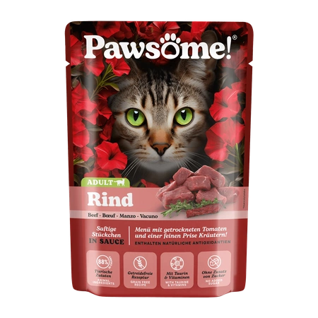 Pozwól swojemu kotu odkryć sekret naszej mokrej karmy Pawsome!®. Wspaniałe koty zasługują na wyjątkowe jedzenie, dlatego oferujemy soczyste kawałki mięsa w pysznym sosie, dopasowane do potrzeb każdego etapu życia.