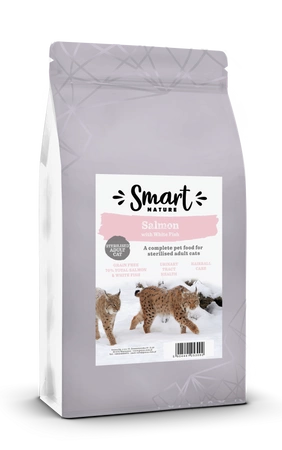 Smart Nature Cat to kompletna, bezzbożowa formuła opracowana z myślą o zdrowiu skóry i sierści kotów, szczególnie tych sterylizowanych. Zawiera aż 70% najwyższej jakości łososia i białych ryb, które są doskonałym źródłem tłuszczu i białka wspierającego piękny wygląd sierści oraz zdrowie układu moczowego.