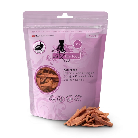 Catz Finefood® Meatz to prawdziwa uczta dla kocich smakoszy – grillowane i delikatnie suszone paski mięsa, które urzekają intensywnym aromatem i naturalnym smakiem. Wariant N°11 z królikiem to idealna przekąska dla kotów o wrażliwym układzie pokarmowym, które potrzebują czystego, lekkostrawnego białka.