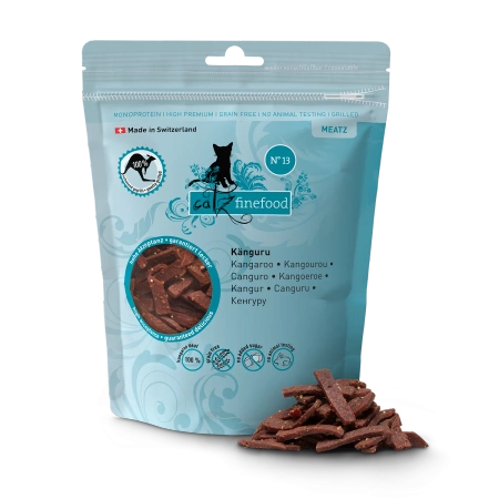 Catz finefood Meatz N° 13 to chrupiące paski 100% grillowanego i suszonego mięsa kangura. Są one doskonałym uzupełnieniem naszej wysokiej jakości mokrej karmy od catz finefood.