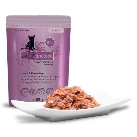 Pełnoporcjowa karma mokra Catz finefood No.11 stworzona jest z soczystej jagnięciny i królika oraz aromatycznych dodatków takich jak żurawina i marchew. Nie zawiera konserwantów, sztucznych barwników i wzmacniaczy smaku oraz jest wolna od GMO.