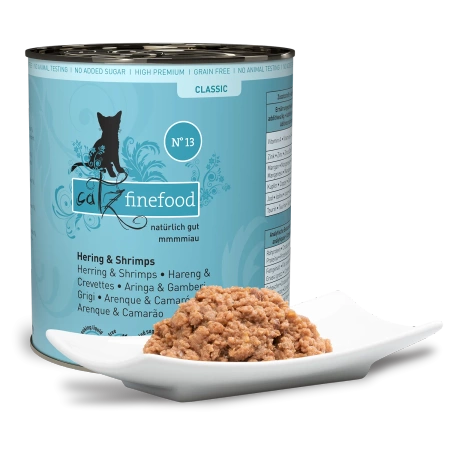 Catz finefood N ° 13 zawiera wiele delikatnych śledzi i kraba oraz zdrowe składniki, takie jak dynia i aloes.