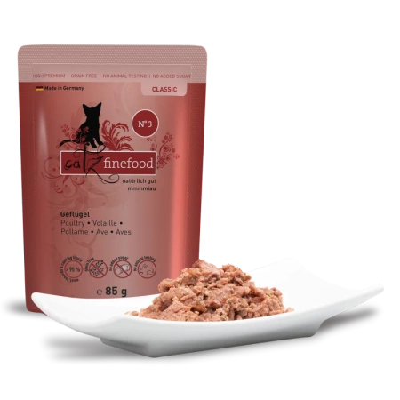 Pełnoporcjowa karma mokra Catz finefood No.3 stworzona jest z soczystego drobiu oraz aromatycznych dodatków takich jak borówki i mniszek lekarski. Nie zawiera konserwantów, sztucznych barwników i wzmacniaczy smaku oraz jest wolna od GMO.