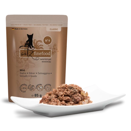 Pełnoporcjowa karma mokra Catz finefood No.9 stworzona jest z soczystej dziczyzny oraz aromatycznych dodatków takich jak żurawina i ziemniaki. Nie zawiera konserwantów, sztucznych barwników i wzmacniaczy smaku oraz jest wolna od GMO.
