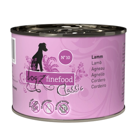 Pełnoporcjowa karma mokra Dogz finefood No. 10 stworzona jest z soczystej jagnięciny oraz aromatycznych dodatków takich jak borówka, cukinia, szałwia i szpinak. Nie zawiera konserwantów, sztucznych barwników i wzmacniaczy smaku oraz jest wolna od GMO.