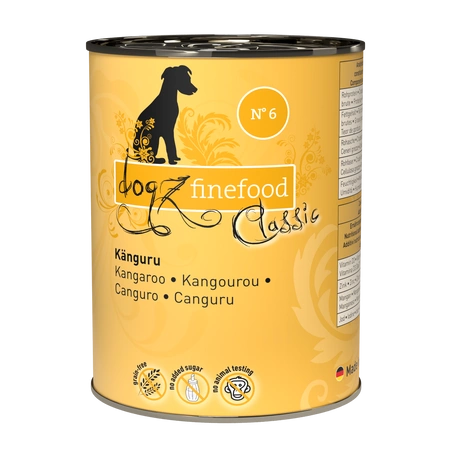 Pełnoporcjowa karma mokra Dogz finefood No. 6 stworzona jest z soczystego mięsa z kangura oraz aromatycznych dodatków takich jak ziemniaki i dzika róża. Nie zawiera konserwantów, sztucznych barwników i wzmacniaczy smaku oraz jest wolna od GMO.