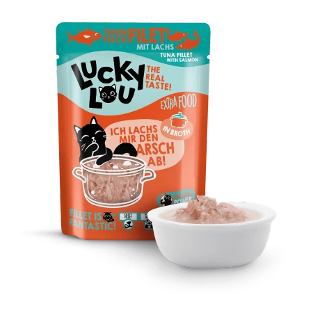 Lucky Lou® Extra Food Tuńczyk i Łosoś w bulionie to wyjątkowa karma uzupełniająca, która łączy smak i jakość w jednym kęsie: