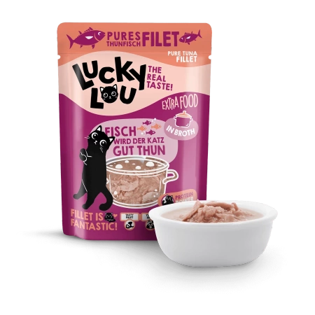 Hej, to ja – Lucky Lou®! Możesz mówić mi Lucky, Lou albo po prostu najbardziej smakowity kot w okolicy. Uwielbiam, gdy mogę się trochę rozpieścić – bo każdy kociak zasługuje na chwilę przyjemności. I właśnie dlatego powstał Lucky Lou® Extra Food Filet z tuńczyka w bulionie – wyjątkowy przysmak, który zachwyci każdego miłośnika rybnych aromatów.