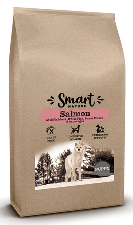 Smart Nature Puppy to pełnowartościowa, bezzbożowa karma stworzona z myślą o potrzebach szczeniąt. Zawiera 60% mięsa ryb: łososia, plamiaka i białej ryby, a także zdrowe dodatki jak bataty i szparagi.